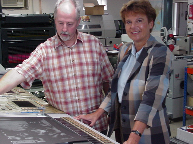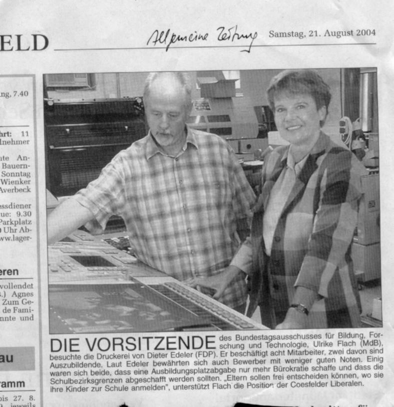 Dieter Edeler, Ratsherr der FDP in Coesfeld, beschäftigt derzeit insgesamt 8 Mitarbeiter. Zwei davon sind Auszubildende; ein dritter hat vor kurzem erfolgreich seine Gesellenprüfung bestanden. Schlechte Schulnoten sind für Dieter Edeler kein Grund, einem jungen Menschen keine Chance in seinem Betrieb zu geben. "Häufig mache ich die Erfahrung", so Edeler, "dass sich gerade diejenigen bewähren, die sich mit weniger guten Noten bewerben. Ein Handwerksberuf wie der des Druckers bietet jungen Männern gute Chancen, zu zeigen, dass sie praktisch etwas drauf haben." Frau Flach interessierte besonders die Haltung Herrn Edelers zu der Frage, inwieweit eine Ausbildungsplatzabgabe den Ausbildungsbetrieben helfen würde. "Davon halte ich gar nichts", so Edeler. "Wer ausbildet, geht freiwillig persönliche Verantwortung ein. Davon sollte man sich nicht freikaufen können." Ebensowenig nützt die Aussicht auf eine staatliche Belohnung, wenn man überdurchschnittlich viel ausbildet. "Die Betriebe, die es machen, tun es jetzt schon freiwillig und aus Überzeugung!" so Edeler. Eine Ausbildungsplatzabgabe schafft einen unnötigen bürokratischen Wasserkopf, darin waren sich Frau Flach und Herr Edeler schnell einig. Zusammen mit den weiteren Coesfelder Spitzenkandidaten, Sybille Schall, Wolfgang Kraska und Dietmer Senger, informierte sich Frau Flach über die Forderung der FDP, in Coesfeld die Schulbezirksgrenzen abzuschaffen. "Eltern sollen frei entscheiden können, wo sie ihre Kinder zur Schule anmelden", so unterstützte Frau Flach die Position der Coesfelder Liberalen.