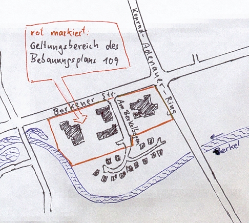 in den nächsten Jahren soll der Bebauungsplan 109 überarbeitet werden. Dieser Bebauungsplan regelt die Nutzung der gewerblichen Flächen zwischen Berkel, Borkener Straße und Konrad-Adenauer-Ring (vgl. Skizze). Zu diesem Zweck hat der Stadtrat eine sogenannte "Veränderungssperre" für den genannten Bereich ausgesprochen. Diese Veränderungssperre besagt folgendes: