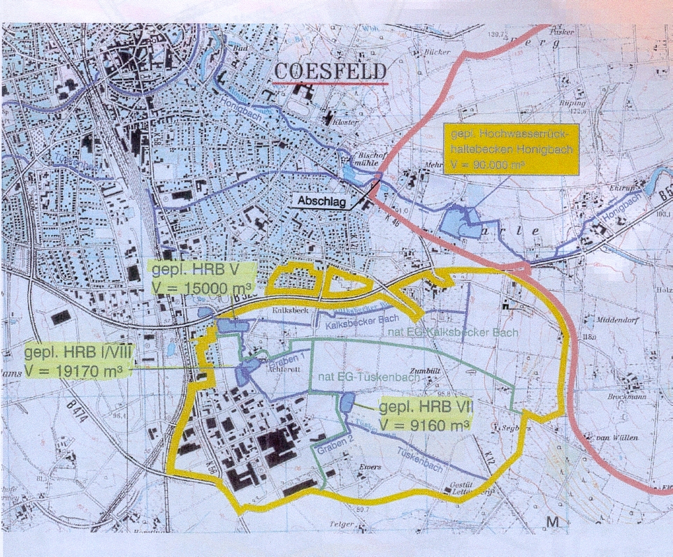 Obwohl noch nicht alle Flächen, die für das Gesamtkonzept notwendig sind, in städtischem Eigentum sind, soll dennoch so schnell wie möglich mit den Arbeiten begonnen werden. Der entsprechende Antrag zum Baubeginn ist bei der Bezirksregierung bereits beantragt. Schon im Dezember 2004 soll damit begonnen werden, Teile des Tüskenbaches offenzulegen und das Hochwasserrückhaltebecken bei der Firma Weiling zu bauen. Spätestens im Sommer 2005 sollen diese Arbeiten beendet sein. Die wasserrechtliche Genehmigung für das Hochwasserrückhaltebecken am Honigbach wurde bereits Ende 2003 durch das Abwasserwerk beantragt. Im September 2004 erfolgte die Bewilligung durch die Bezirksregierung Münster. Aufgrund der schwierigen Bodenverhältnisse und zur Vermeidung witterungsbedingter Mehrkosten wird im Frühjahr 2005 mit der Baumaßnahme begonnen. Das Becken soll im Herbst 2005 fertiggestellt sein. Die Kosten für den Bau des Hochwasserrückhaltebeckens am Honigbach werden im Jahr 2005 etwa 1.858.000,00 Euro betragen. Das Land trägt davon 1.535.800,00 Euro, die es von 2004 bis 2007 in vier Teilraten auszahlen wird. Der Bau des Hochwasserrückhaltebeckens östlich der Firma Weiling
