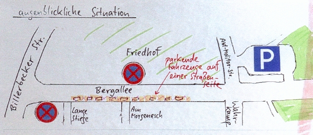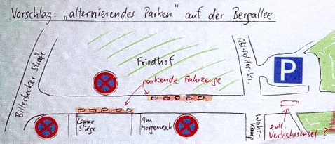 zu schnellen Erfolgen führte der Ortstermin an den Friedhöfen an der Bergallee, zu dem die FDP am Donnerstag, den 20. Januar auf Anregung von Anwohnern eingeladen hatte. Vornehmliches Anliegen war die Verkehrssituation auf der Bergallee, die mit Vertretern der Stadt Coesfeld, des Kreises und der Kirchen erörtert wurde. Erstes Ergebnis wird eine bessere Ausschilderung des Parkplatzes an der Bergallee sein. Dadurch soll erreicht werden, dass Friedhofsbesucher weniger auf den umgebenden Straßen parken. Der Vertreter der Stadtverwaltung versprach, schon innerhalb der folgenden Tage eine entsprechende Beschilderung anbringen zu lassen. Ebenso kurzfristig soll eine Lösung gegen die hohen Geschwindigkeiten auf der Bergallee gefunden werden. Häufig beobachten die Anwohner, dass die Fahrzeuge den Berg herunter in den Ort hineinfahren, ohne wesentlich abgebremst zu haben. Dieses Problem soll dadurch abgemildert werden, dass ein sogenanntes "alternierende Parken" auf der Bergallee eingerichtet wird. Bislang besteht ein durchgängiges Halteverbot auf der dem Friedhof zugewandten Seite der Bergallee, während auf der gegenüberliegenden Straßenseite häufig PKW in einer sehr langen Reihe parken. Dadurch entsteht für nach Coesfeld hineinfahrende Autofahrer der Eindruck einer "freien Bahn". Zudem verleitet die lange Reihe parkender Fahrzeuge zu schnellem Fahren, da man diese Stelle schnell vor einem möglichen Gegenverkehr passieren möchte. "Alternierendes Parken" bedeutet demgegenüber, dass wechselseitig - mal auf der einen, mal auf der anderen Seite - ein Halteverbot eingerichtet wird, während die Autos jeweils auf der anderen Seite parken dürfen. Dadurch wird die Straße optisch verengt, so dass die Autofahrer automatisch langsamer und vorsichtiger fahren. Darüber hinaus soll die Machbarkeit einer Verkehrsinsel auf