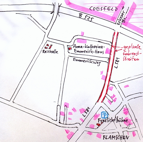 Radfahrer, die die Rekener Straße in Richtung Flamschen und zurück befahren, sollen künftig sicherer fahren können. Der Ausschuss für Umwelt, Planen und Bauen beschloss auf seiner Sitzung vom 19. Januar 2005, auf beiden Seiten der Rekener Straße zwischen der Umgehungsstraße und der Freilichtbühne Fahrradstreifen anzulegen. Da die Straße dort eine Landesstraße ist (L 581), wurde die Stadtverwaltung beauftragt, diese Maßnahme beim zuständigen Landesbetrieb Straßenbau des Landes NRW zu beantragen. Zudem soll in Höhe des Abzweigs zur Freilichtbühne eine Querungshilfe auf der Fahrbahn eingerichtet werden. Die Fraktion von ProCoesfeld ist der eigentliche Initiator dieses Beschlusses. Sie hatte ursprünglich beantragt, einen kombinierten Fuß-/Radweg anzulegen, der stadtauswärts auf der rechten Straßenseite verlaufen sollte. Zusätzlich sollte in Höhe des Abzweigs zur Freilichtbühne eine Ampel aufgestellt und das Tempolimit auf 50 km/h festgelegt werden. Die Stadtverwaltung hatte dem Antrag in dieser Form widersprochen. Er sei hinsichtlich des tatsächlichen Verkehrsaufkommens in dieser Form weder nötig noch finanzierbar. Mit Stimmen von SPD und CDU wurde schließlich der obige Beschluss