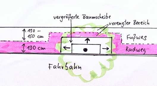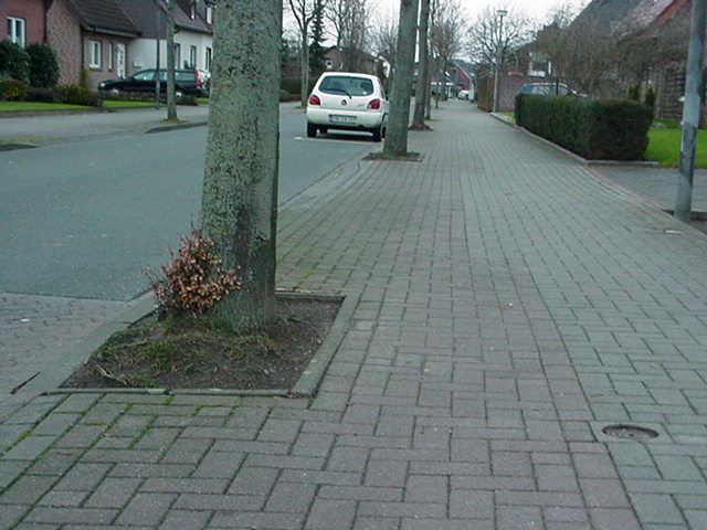die Straßenbäume im Westeresch, in der Schlesienstraße und in der Adolf-Meyer-Straße haben zu kleine Baumstandorte. Die Folge: Die Wurzeln drücken die Pflasterung hoch. Außerdem droht auf mittlere Sicht, dass der Baum krank wird und abstirbt. Der Ausschuss für Umwelt, Planen und Bauen beschloss auf seiner letzten Sitzung im alten Jahr, die Standflächen für die Bäume auf eine Breite von 1,40 m bzw. 1,50 m zu vergrößern. Die Arbeiten sollen mit eigenem Personal und "im Rahmen der zur Verfügung stehenden Haushaltsmittel" (Zitat aus der Beschlussvorlage) durchgeführt werden. Diese Einschränkung ist wichtig, denn: Unsere Stadt ist pleite. Mit der Vergrößerung der Baumscheiben verringert sich allerdings der Platz, um den Fuß- und den Radweg vorbeiführen zu können. Zur Lösung dieses Problems folgte der Ausschuss einer Anregung, die auf der Bürgerversammlung vom 18.11.2004 geäußert wurde. Demnach sollen sich Fuß- und Radweg den engen Bereich neben den Baumstandorten "teilen". Die verbleibende Fläche - sie ist nach der Vergrößerung der Baumscheiben je nach Standort zwischen 1,20 m und 1,30 m breit - soll jeweils zur Hälfte rot und grau gepflastert werden. Somit könnten Radfahrer weiterhin die Radwege benutzen. Im Bereich der engen Stellen neben den Straßenbäume müßten Fußgänger und Radfahrer allerdings Rücksicht aufeinander nehmen.