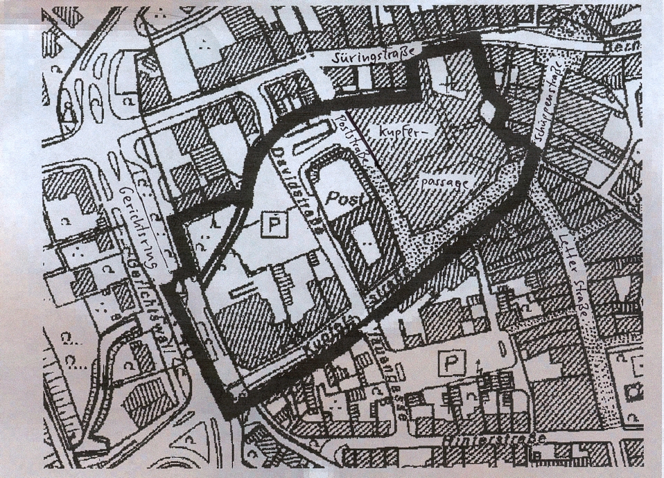 schon seit längerem steht die Frage im Raum, was auf dem Postareal entstehen soll, wenn die Post dort auszieht. "Ein großer Textilanbieter", so Beigeordneter Backes am 15.02.2005 in der AZ, sei bereits als konkreter Interessent im Gespräch. Bereits auf der Sitzung des Ausschusses vom 08.12.2005 hatte die Immobilien Treuhand Gesellschaft (ITG) Düsseldorf ihre Investorenpläne für diesen Bereich den Mitgliedern des Rates vorgestellt - allerdings zunächst in nichtöffentlicher Sitzung. Aus diesem Grund war die Öffentlichkeit bislang auch noch nicht darüber informiert. Investor und Grundeigentümer sind sich zwischenzeitig in den grundsätzlichen Fragen "handelseinig" geworden. Die Stadt möchte nun den Weg bereiten, damit die Pläne dieses Investors umgesetzt werden können. Zunächst ist es erforderlich, dass der für diesen Bereich geltende Bebauungsplan (Bebauungsplan Nr. 6 - "Neuordnung der Innenstadt") geändert wird. Er umfasst den Innenstadtbereich zwischen der Kupferstraße im Süden und der südlichen Bebauung der Süringstraße bzw. dem Südufer der Innenstadtberkel im Norden (vgl. Skizze). Neben der Kupferpassage, die im Rahmen dieser Planungen erweitert werden